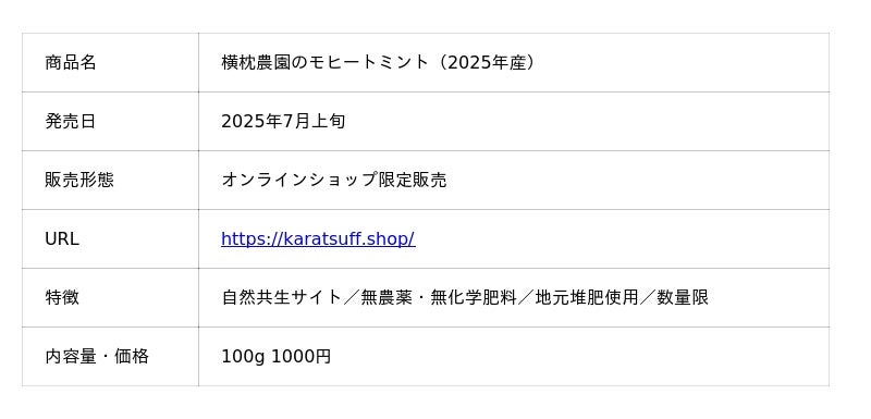 NPO法人唐津FARM&FOOD(所在地:佐賀県唐津市、代表:木下翔太)が運営する「横枕農園」は、環境省認定の自然共生サイト内で栽培した“モヒートミント”の収穫を迎え、7月上旬よりオンラインショップ限定で数量限定販売を開始しました。