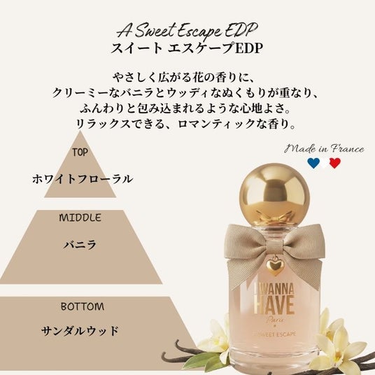 ■スイート エスケープ EDP (50mL / オープン価格)やさしく広がる花の香りに、クリーミーなバニラとウッディなぬくもりが重なり、ふんわりと包み込まれるような心地よさ。リラックスできる、ロマンティックな香り。