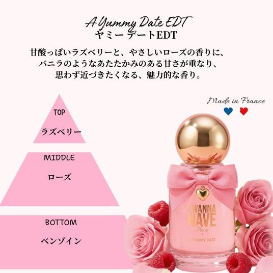 ■ヤミー デート EDT (50mL / オープン価格)甘酸っぱいラズベリーと、やさしいローズの香りに、バニラのようなあたたかみのある甘さが重なり、思わず近づきたくなる、魅力的な香り。