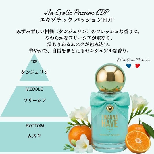 ■エキゾチック パッション EDP (50mL / オープン価格)みずみずしい柑橘(タンジェリン)のフレッシュな香りに、やわらかなフリージアが重なり、温もりあるムスクが包み込む。華やかで、自信をまとえるセンシュアルな香り。
