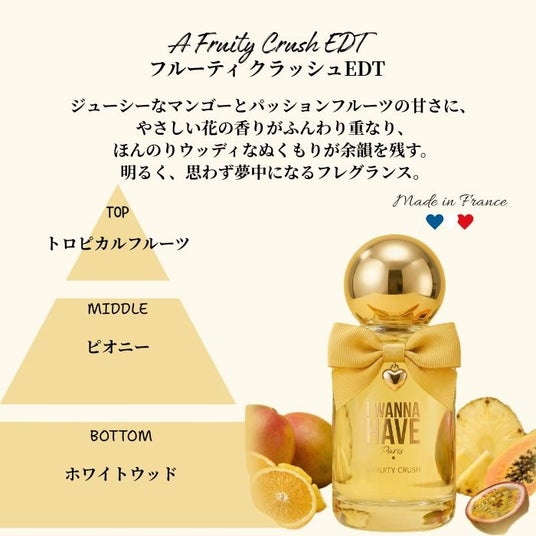 ■フルーティ クラッシュ EDT (50mL / オープン価格)ジューシーなマンゴーとパッションフルーツの甘さに、やさしい花の香りがふんわり重なり、ほんのりウッディなぬくもりが余韻を残す。明るく、思わず夢中になるフレグランス。