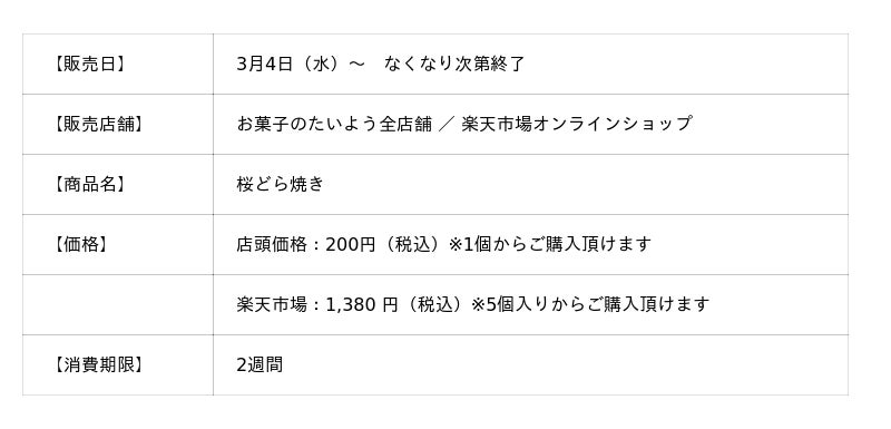 株式会社太陽社(所在地:千葉県匝瑳市飯倉293、代表取締役:片岡正裕)が展開する、千葉県で長年愛され続ける菓子店「お菓子のたいよう」は、桜スイーツ第4弾となる春限定商品「桜どら焼き」を、2026年3月4日(水)より販売いたします。たいよう自慢の、しっとり・ふんわりとした皮に合わせるのは、静岡県産桜葉をたっぷり練り込んだ特製の桜餡。頬張った瞬間、口いっぱいに広がるのは――圧倒的な桜の芳醇さ。桜を愛する人のために仕立てた、春限定のどら焼きです。