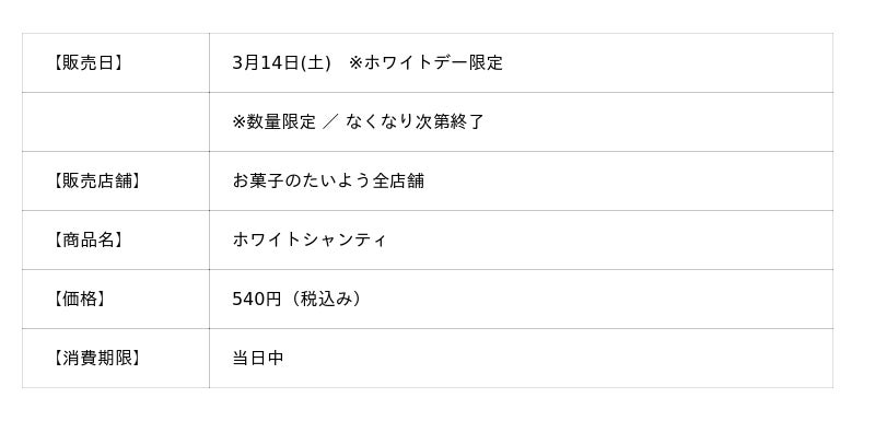 株式会社太陽社(所在地:千葉県匝瑳市飯倉293、代表取締役:片岡正裕)が展開する、千葉県で長年愛され続ける菓子店「お菓子のたいよう」は、希少な3Lサイズの銚子産とちおとめを“丸ごと1個”使用した人気スイーツ『いちごシャンティ』を、ホワイトチョコ仕立てに進化させた「ホワイトシャンティ」として、2026年3月14日(土)のホワイトデーに1日限定で販売いたします。