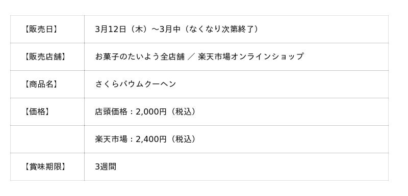 株式会社太陽社(所在地:千葉県匝瑳市飯倉293、代表取締役:片岡正裕)が展開する、千葉県で長年愛され続ける菓子店「お菓子のたいよう」は、桜スイーツラストとなる第5弾として、春限定のグルテンフリーバウム「さくらバウムクーヘン」を3月12日(木)より販売いたします。