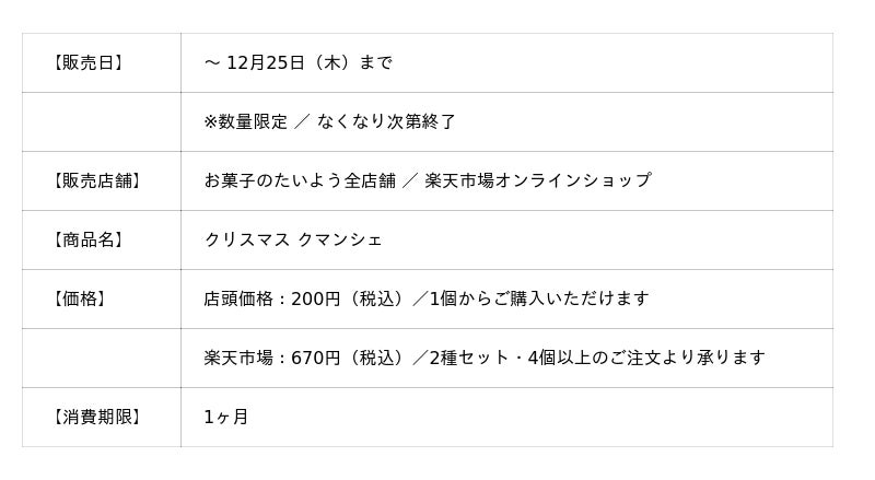 株式会社太陽社(所在地:千葉県匝瑳市飯倉293、代表取締役:片岡正裕)が展開する千葉県で長年愛される菓子店「お菓子のたいよう」は、クリスマススイーツ第2弾として、クマ型メープルフィナンシェ『クマンシェ』のクリスマス限定デザインを 11月28日(金)より発売いたします。