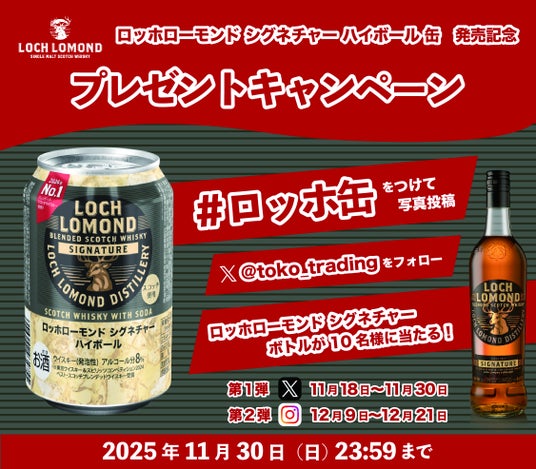 株式会社都光(東京都台東区)は、「ロッホローモンド シグネチャー ハイボール 缶」の発売を記念し、スコッチウイスキー「ロッホローモンド シグネチャー」のプレゼントキャンペーンを2025年11月18日(火)より開催します。