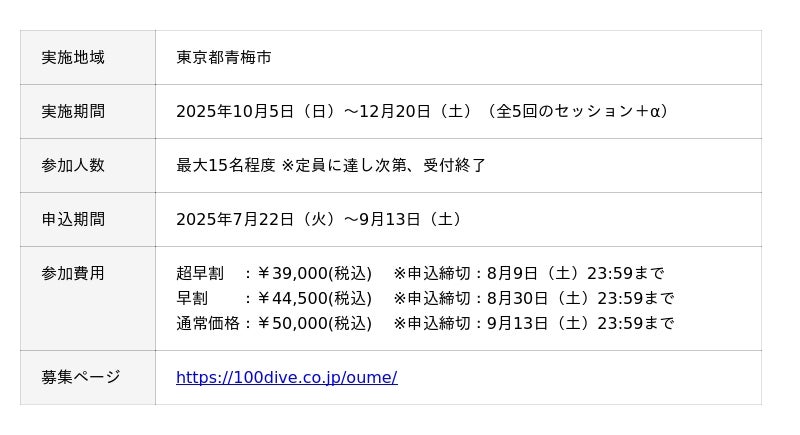 – 参加をご検討の方向けに、無料のオンライン説明会を開催いたします。詳細・お申込みはこちら:https://100dive.co.jp/oume/