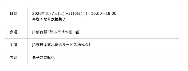 2026年3月7日(土)~3月9日(月)まで仙台駅3階みどりの窓口前にて開催