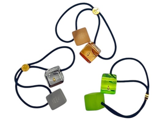 THE HAIR BAR TOKYOオリジナルのシングルオーナメントのポニーはすべて2重のループが基本仕様。髪をホールドする機能が高く、スタイリングの容易さには定評があります。この機能性を維持したまま、よりスタイリッシュに多様なアレンジを楽しめるような画期的なデザインになっているのがこちらのDoubleシリーズです。中心から双方に分かれるループ(ゴム)の長さは通常ポニーの倍。この長さこそが高い機能性を実現させる特徴なのです。オーナメントを上部にまとめ、中心から左右に分かれるループを重ねるかたちで手に通すことで、通常のポニーの方法と同様に、髪を束ねることができます。