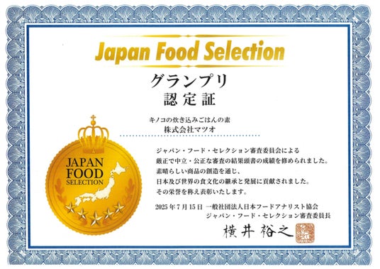 パン・フード・セレクション】食品・飲料部門(2025年7月)にて株式会社マツオ(本社:富山県富山市、代表取締役社長 小林幸太)の「キノコの炊き込みごはんの素」がグランプリを受賞いたしました。