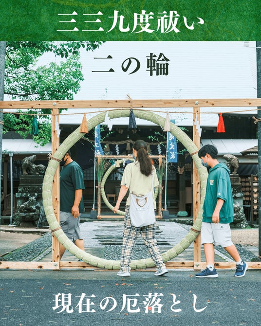 参道・鳥居前・社殿前の三箇所に「茅の輪」が設置されており。「一の輪」「二の輪」「三の輪」と名付けられています。それぞれの茅の輪には意味があり、「一の輪」が「過去の浄化」、「二の輪」が「現在の厄落とし」、「三の輪」が「未来の厄除け」となっており、「過去・現在・未来」のケガレを祓うものとなっています。