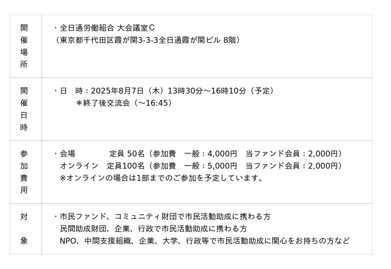 この研修交流会をきっかけに、様々な組織で市民活動助成に携わる皆さま同士の、楽しくも深い交わりが生まれ育つことも期待します。市民活動助成に携わる方や関心をお持ちの皆様のご参加をお待ちしております。