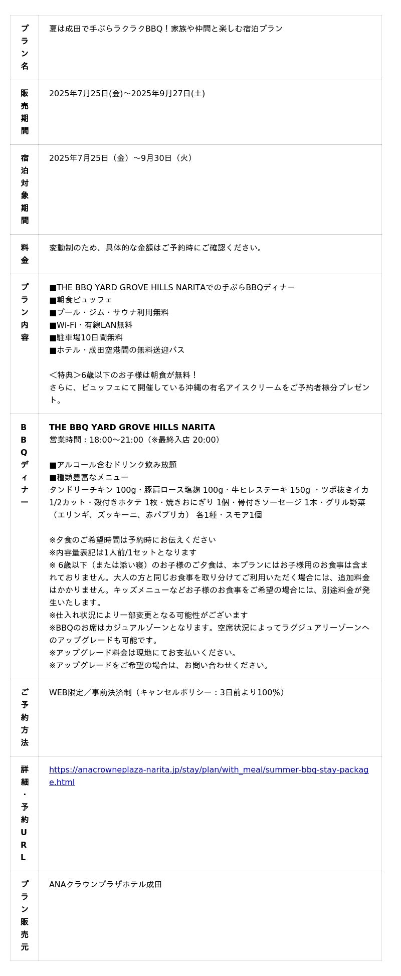 2025年7月25日(金)から9月30日(火)までの期間中、成田空港至近でアクセスも良好なANAクラウンプラザホテル成田にご宿泊のうえ、当施設の本格BBQディナーをお楽しみいただける特別なプランです。