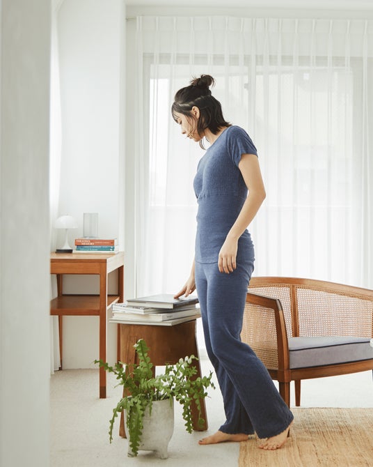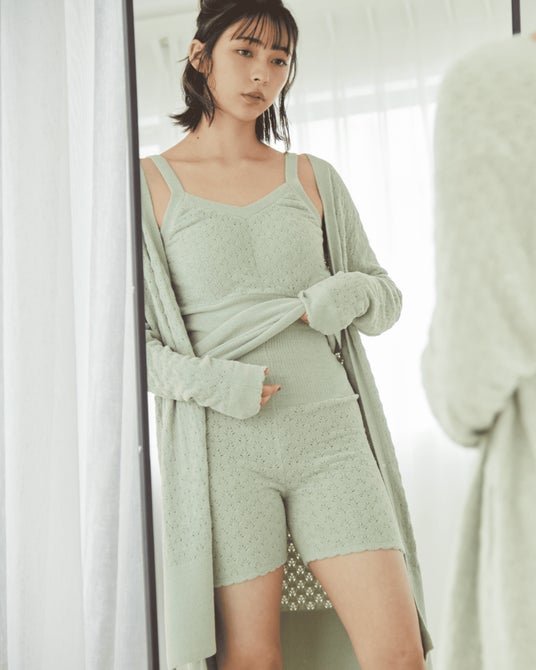 唯一無二の“透かし編み”をデザインに取り入れたニットランジェリーは、伸縮性に優れ、肌にやさしくフィットしながら、着るだけで気持ちよく自然と体を温めてくれる。