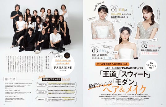 気になるビューティ特集は、花嫁たちから大人気のアーティスト集団「PARADISE」が提案する【王道】【スウィート】【モダン】最旬トレンドヘア&メイク。
