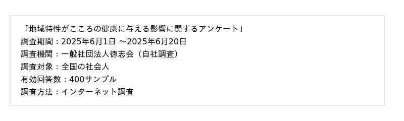 一般社団法人徳志会(所在地:東京都品川区、代表理事:河口雅弘)は、心療内科・精神科クリニックである新宿心療内科よりそいメタルクリニック(新宿駅東口徒歩3分)横浜心療内科よりそいメタルクリニック(横浜駅西口徒歩2分)柏心療内科よりそいメンタルクリニック(柏駅徒歩1分、2025年8月オープン予定)を運営し皆様のメンタルヘルスをサポートしております。今回は地域特性とこころの健康に関する調査を実施したので、その結果を紹介します。