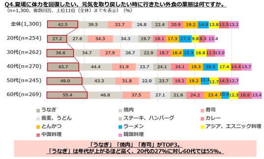 ・夏場の体力回復時に行きたい店は、「うなぎ」「焼肉」「寿司」がTOP3。「うなぎ」は年代が上がるほど高く、20代の27%に対し60代では55%。