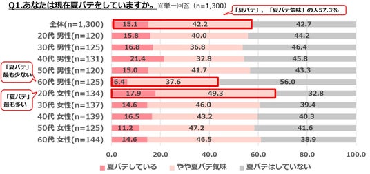 ・夏バテしている人は15%で、夏バテ気味の人は42%。夏バテ及び夏バテ気味が最も多いのは20代女性で、反対に最も少ないのは60代男性。