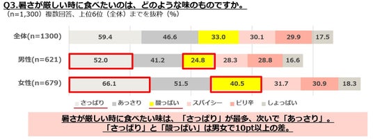 ・暑さが厳しい時に食べたいのは「さっぱり」が最多で、次いで「あっさり」。「さっぱり」と「酸っぱい」は男女で10pt以上の差有り。