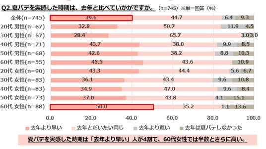 ・夏バテを実感した時期は「去年より早い」人が4割で、60代女性では半数とさらに高い。