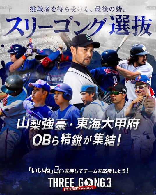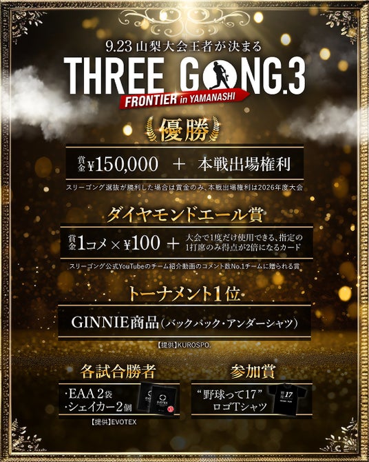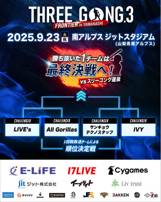 2025年9月23日(火・祝)に南アルプス ジット スタジアムにて開催される「THREE GONG .3 FRONTIER in YAMANASHI」。今大会の参戦チーム、対戦カードが決定しました。さらに次回大会となる「THREE GONG -GRAND SLAM- in NAGOYA」がバンテリンドーム ナゴヤにて実施決定! ますます盛り上がりをみせる本大会の最新情報をお届けします。