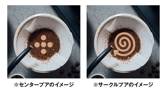 「Revonia」で採用している「サークルプア式」は、お湯を回転させながらコーヒー粉にお湯を注ぐ「ハンドドリップのお湯の注ぎ方」として知られています。