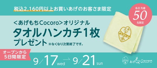 9月17日(水)~21日(日)の5日間限定で、「あげもちCocoro」のロゴマーク入りタオルハンカチをプレゼントいたします。