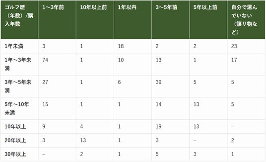 ゴルフ歴で見ると「自分で選んでいない(譲り物など)」と回答したゴルファーは、主に経験年数が浅い層に多いことがわかります。