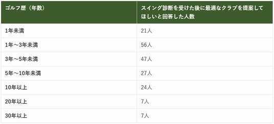 また以下のように、ゴルフ歴が浅いゴルファーほど、クラブ選びに関してデータを元にした個別のサポートを希望していることが分かります。