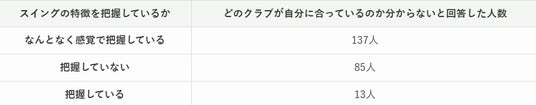 また「スイングの特徴を把握しているか」が、「自分に合うクラブが分からない」という悩みと深く関係していることも見えてきました。