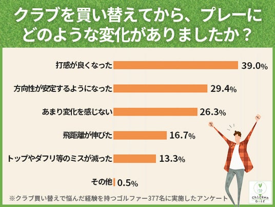 クラブを買い替えてから最も多くのゴルファーが感じた変化は、「打感が良くなった」ことで、39.0%(147人)にのぼりました。