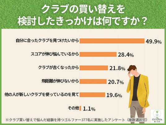 買い替え理由のトップは「自分に合ったクラブを見つけたい」で49.9%、次いで「スコア停滞」が28.4%