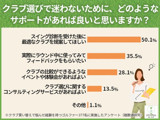 クラブ選びで迷わないためにゴルファーが最も望んでいるサポートは、「スイング診断を受けた後に最適なクラブを提案してほしい」で50.1%(189人)となっています。