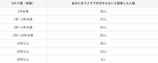 また、3年~5年未満(54人)や5年~10年未満のゴルファー(29人)でも、同様の悩みを抱えていることから、経験を積んでもクラブ選びの難しさが依然として残るという実態がうかがえます。