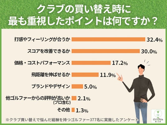 ゴルフクラブを買い替える際にゴルファーが最も重視するポイントは、「打感やフィーリングが合うか」が32.4%(122人)、「スコアを改善できるか」が30.0%(113人)という結果となりました。