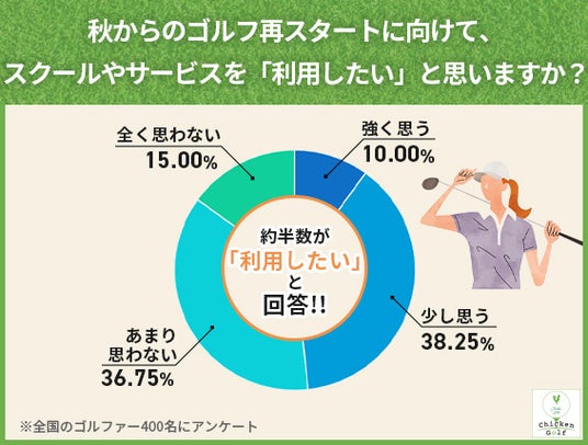 夏にゴルフ練習を制限していたゴルファーに「秋からのゴルフ再スタートに向けたスクールやサービスへの関心」について尋ねたところ、「利用したい」と考えるゴルファーが193人(48.25%)に達し、ほぼ半数が専門的な指導への関心を示していることが明らかになりました。