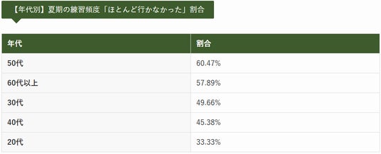 中でも30代では約半数が練習にほとんど行っておらず、「子どもが夏休み」「家族行事が多忙」といった夏季特有のライフイベントが、この世代に集中的に影響していると考えられるでしょう。