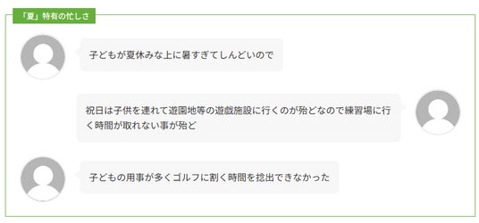 また、「帰省等もあって、なかなか時間が作れなかったから」「他に優先することがあった」という回答もあり、夏季の特別なイベントや行事がゴルフ練習の時間を割けられない実態が浮き彫りとなりました。