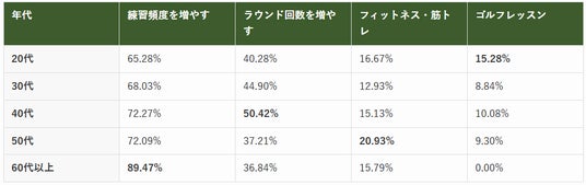 また、40代が「ラウンド回数を増やす」において50.42%と全年代中最も高い割合を示していることから、20代は技術向上とラウンド体験のバランス、30~40代は実践重視、50代以上は基礎と体力の再構築という年齢による学習スタイルの明確な違いが浮き彫りになっています。