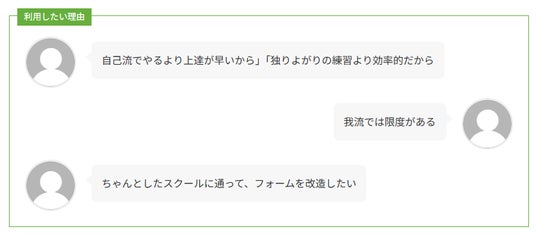 他にも、「以前スコアが伸び悩んでいたときにスクールで改善したから」という過去の成功体験に基づく回答や、「長く続けていきたいので、基礎からしっかり学んで上手くなりたいから」という長期的な視点での学習意欲も見られました。