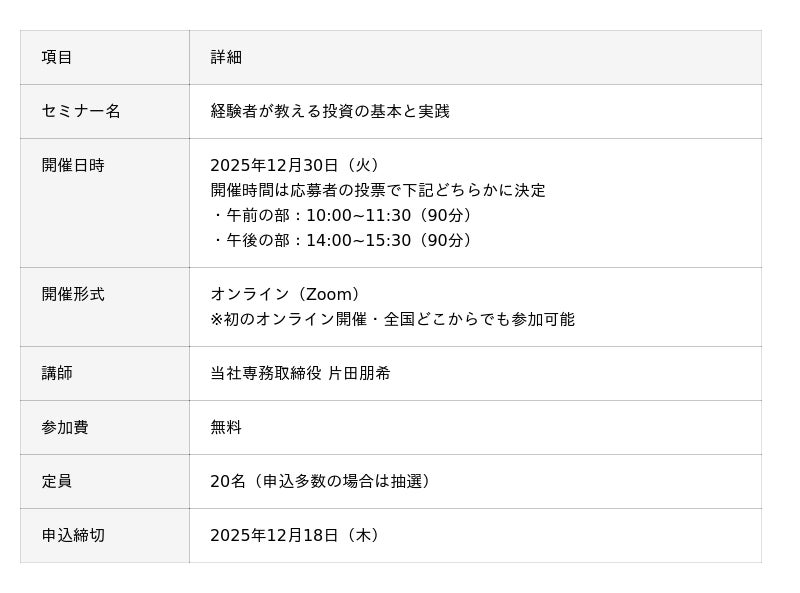 年末の時間を使って、2025年を振り返り、2026年の投資計画を立てる絶好の機会です。当選者の事前アンケートで「知りたいこと」を自由にお伺いし、その内容を最大限資料に反映する、参加者と一緒に作り上げる双方向型のセミナーです。