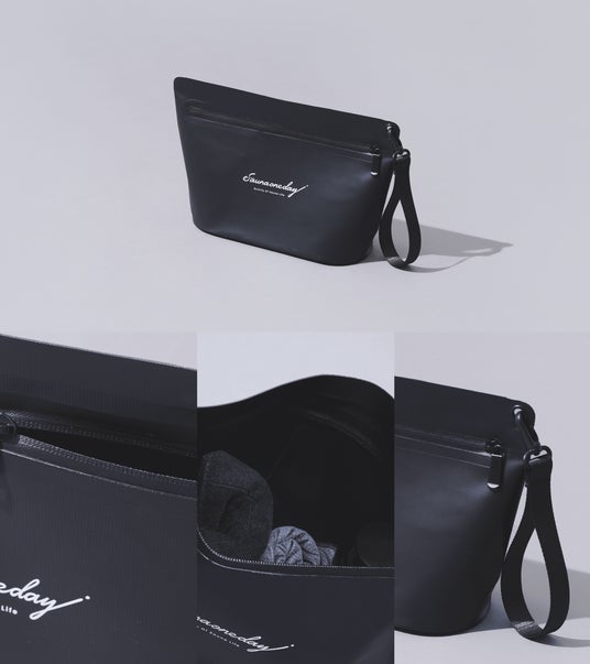 余計なパーツを全て削ぎ切った、1ポケットのクラッチスタイル。メインファブリックにはアウトドアユースでも使われる耐久性の高いPVCを採用。完全に水を遮断する素材で底マチも広いから、浴室内のどこにでも置いておける。棚や置き場がない時は、フックにかけて使えるストラップも装備。SaunaonedayのMINIMAL BOTTLE 200、COOL DRY TOWEL、DAILY SAUNA HATが同時に収納できて、残りのスペースにシャンプーなどのバスグッズも収納できるサイズ設計。