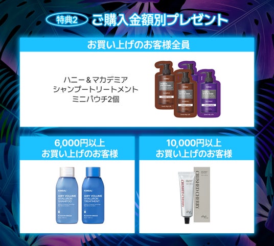 ご購入金額に応じてプレゼント・お買い上げのお客様全員には【ハニー&マカデミアシャンプー・トリートメント】ミニパウチ2個をプレゼント