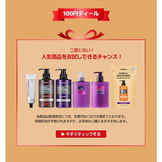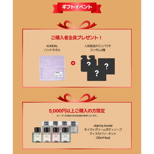 – オープンを記念して、期間中にご購入いただいたお客様を対象に、特別なプレゼントやお得な企画をご用意しております。1. ご購入者全員プレゼントKUNDALハンドタオル + 人気商品の「お試しセット」3種(ランダム)