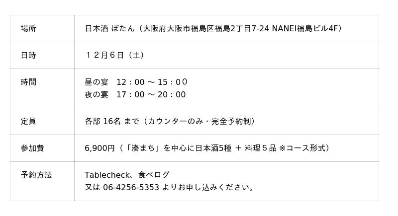 ぽたん株式会社(本社:大阪市福島区福島2-7-24 4F、代表取締役:久米 佑宜)が運営する)大阪・福島の日本酒専門店「日本酒 ぽたん」にて、今代司酒造株式会社(所在地:新潟市中央区)が手がける新ブランド「湊まち」の一日限りのコラボイベント「湊まち 船出の宴」を2025年12月6日(土)に開催します。