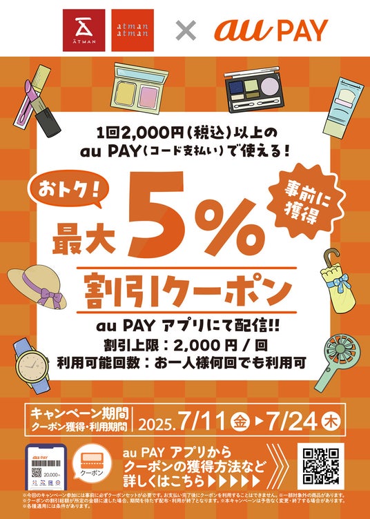 京王グループでコスメを中心に生活雑貨を販売する株式会社京王アートマン(本社:東京都多摩市、以下 京王アートマン)は、2025年7月11日(金)から2025年7月24日(木)まで対象店舗にてご利用いただける「au PAY 最大5%割引クーポン」を実施いたします。