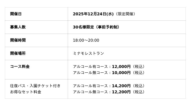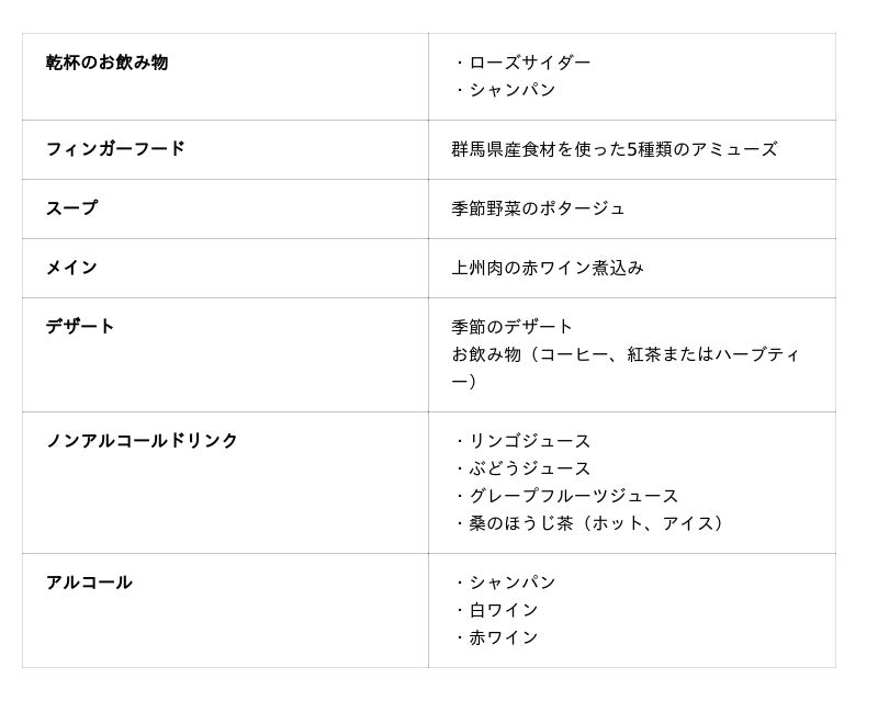 目玉は、クリスマスイブ(12月24日)限定30名様の超プレミアムイベント「花と音楽のスペシャルクリスマスディナー」。さらに、県内外からのアクセスをサポートするため、前橋駅発着の直行シャトルバスを運行いたします 。