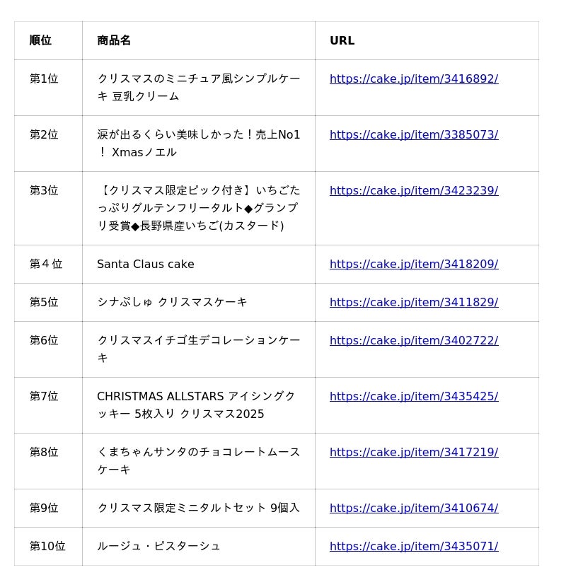 ケーキ・スイーツ専門通販サイト「Cake.jp(ケーキジェーピー)」を運営する株式会社Cake.jp(本社:東京都新宿区、代表取締役:高橋 優貴)は、2025年最新のクリスマスケーキ人気ランキングを発表いたします。