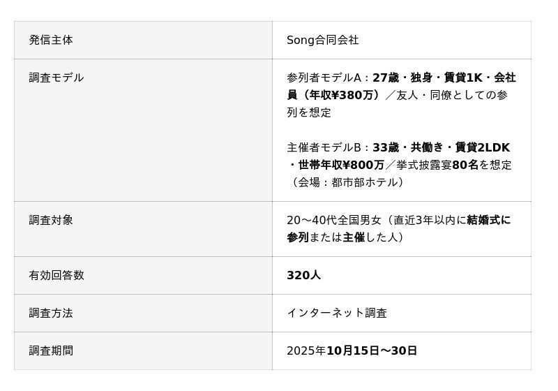 本調査は、参列者の「ご祝儀¥30,000」という相場観と、主催者の一人当たり原価¥33,000+固定費というコスト現実のズレを定量化しました。