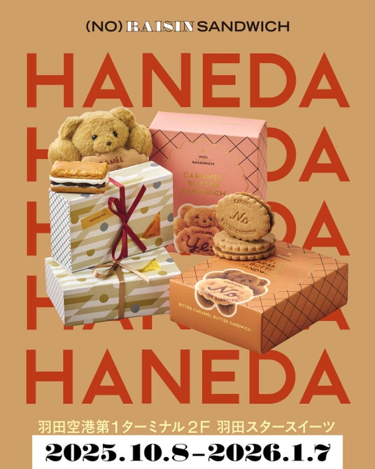 株式会社NRS(本社:東京都品川区 代表取締役:奥山紗季子)による菓子ブランド「(NO) RAISIN SANDWICH (ノーレーズンサンドイッチ)」は、2025年10月8日(水)から2026年1月7日(水)まで、羽田空港 第1ターミナル 2F マーケットプレイス 羽田スタースイーツにて、ポップアップショップをオープン致します。店舗では、手土産にも最適な常温のバターサンド「キャラメルバターサンドイッチ」をはじめ、季節で変わる果実やナッツのバターサンド「ノーレーズンサンドイッチ」など、多数商品を販売致します。